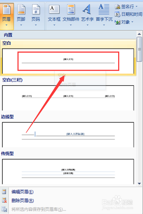 点击“页眉”,选择一个页眉样式