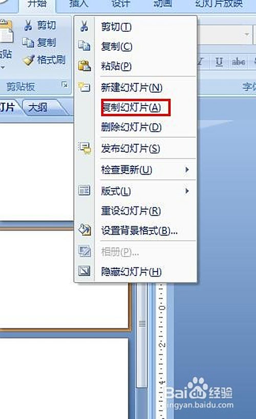 单击鼠标右键,选择“复制幻灯片”,此时在被复制的幻灯片下面就新增一页不异的幻灯片。
