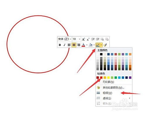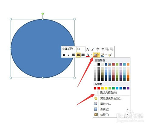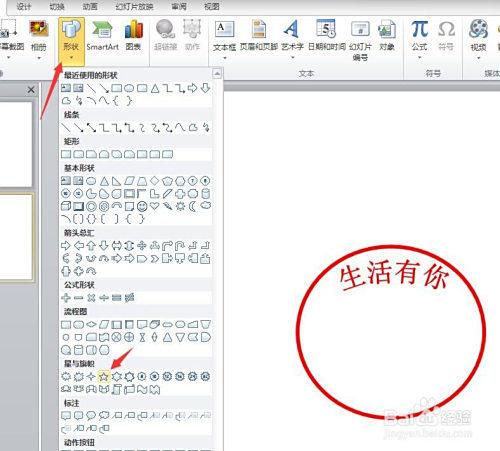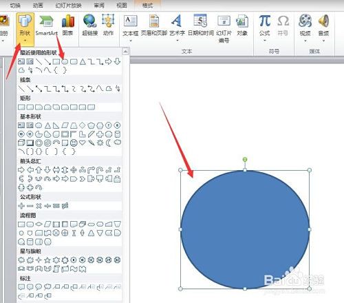 打开PPT软件,插入——外形——椭圆,并在空白处绘制圆形。如图: