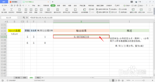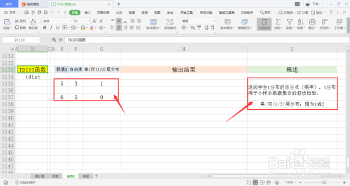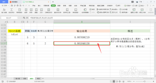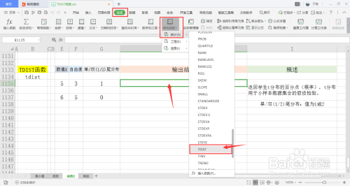 选中一个单位格用于存放输出成果,在菜单栏的公式下,打开其他函数中的统计下拉框,点击此中的TDIST函数。