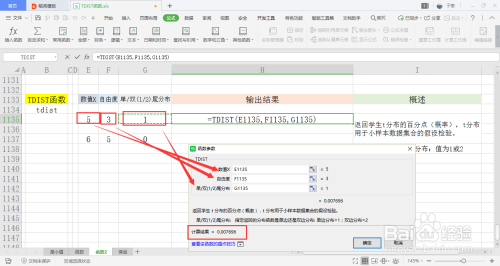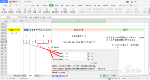 可以看到会弹出一个弹窗,里面有三个参数需要填入,别离是数值X、自由度、单/双(1/2)从头至尾分布。可以手动输入,也可以鼠标选中单位格的内容引用。