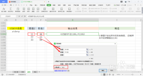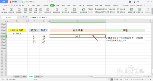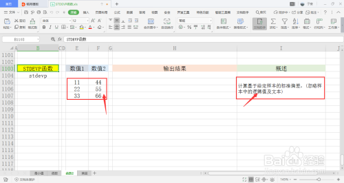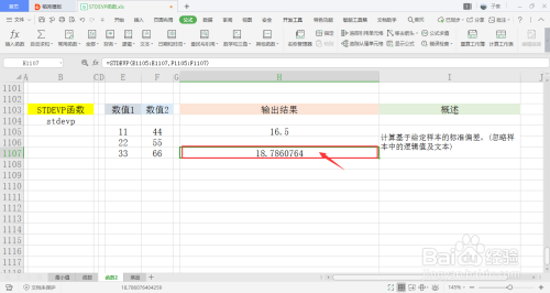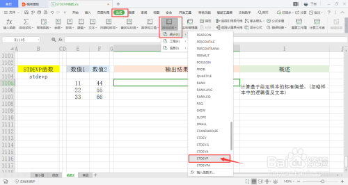 选中一个单位格用于存放输出成果,在菜单栏的公式下,打开其他函数中的统计下拉框,点击此中的STDEVP函数。