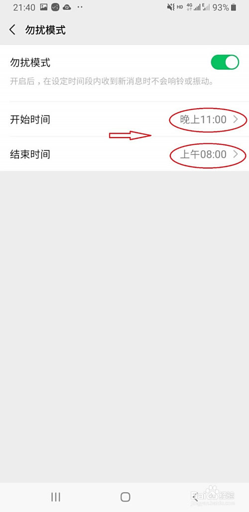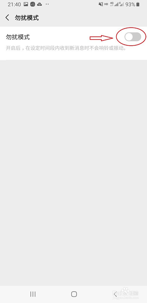 进入界面后,点击“勿扰模式”右侧按钮,按钮酿成绿色则暗示开启勿扰模式。