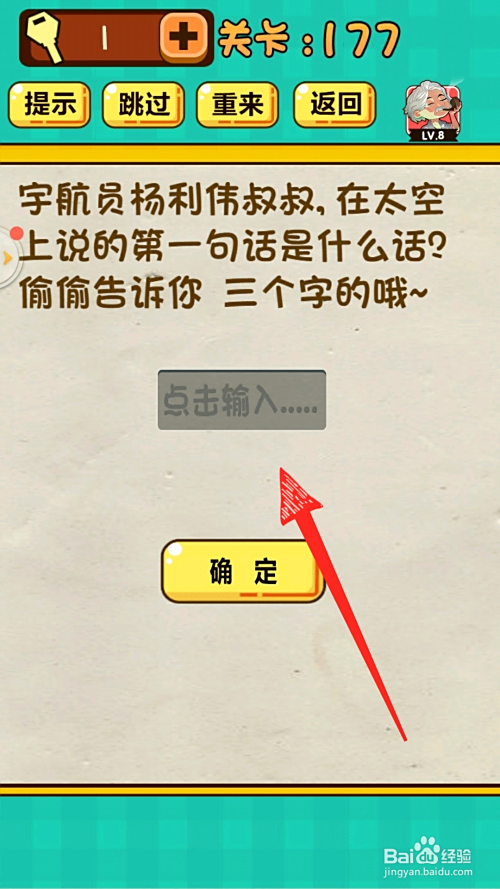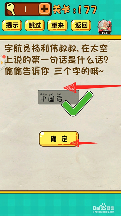 5.最后成果如下图,输入谜底“中国话”,点击确定,呈现绿色对勾,即可过关。