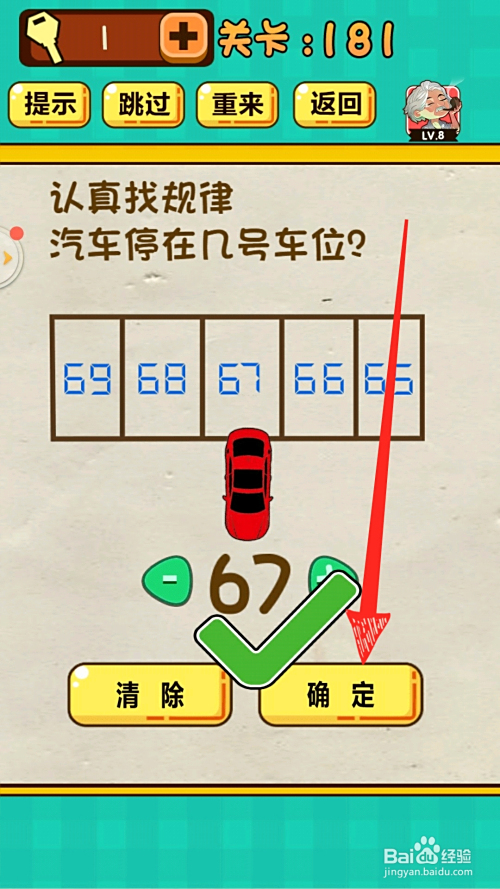5.最后成果如下图,输入谜底67,点击确定,呈现绿色对勾,即可过关。