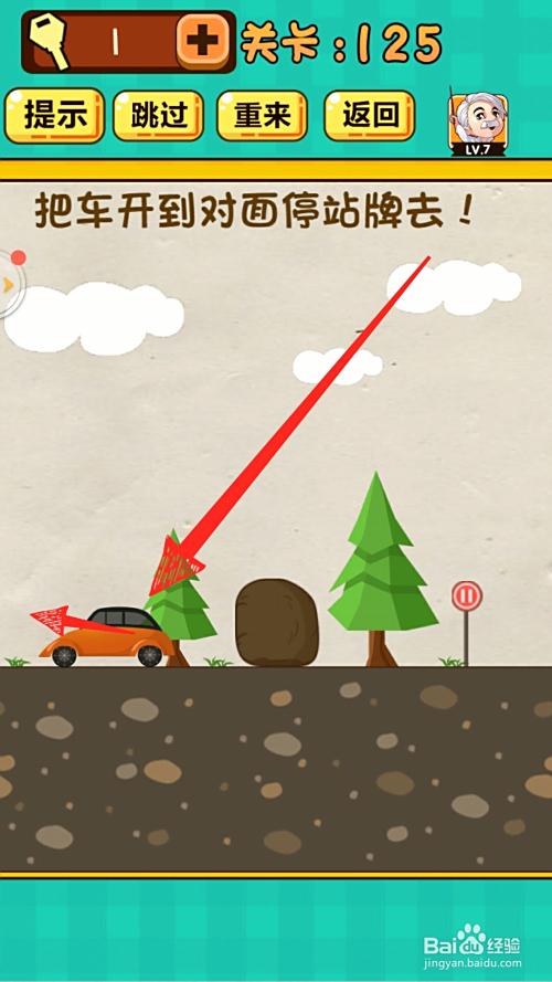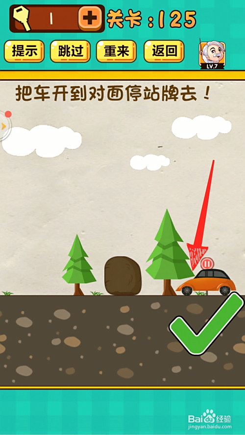 5.最后成果如下图,汽车开到站牌处,呈现绿色对勾,即可过关。