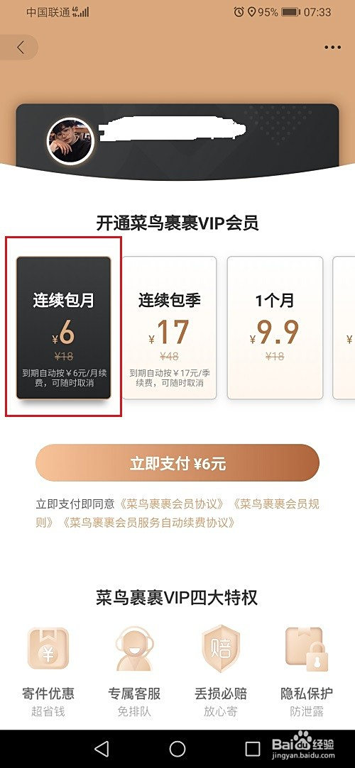 第一步菜鸟裹裹开通主动续费之后,可以在支付宝中进行打消,如下图所示:
