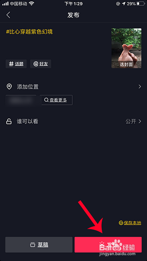 5.找到绿色场景,点击起头按钮,拍摄起头后,用手比心画面酿成紫色,录制完毕后,点击“下一步”,起上题目点击“发布”即可。