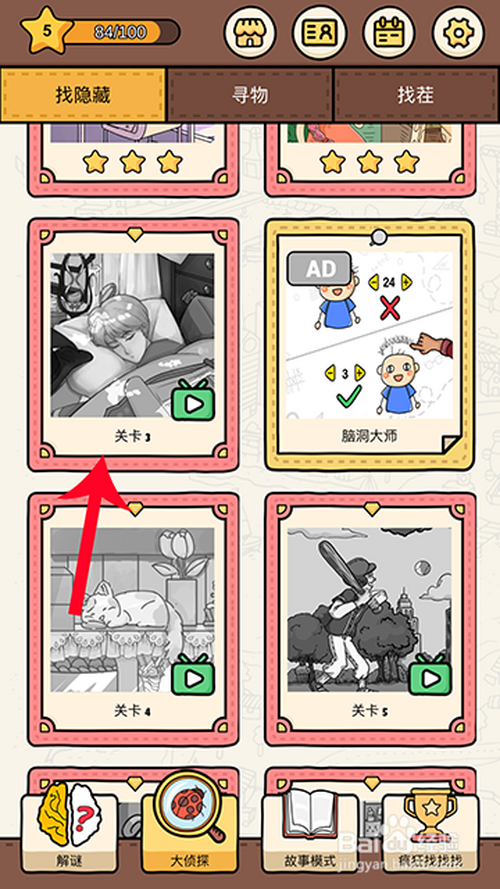 进入大侦察后,点击特别关卡第三关,不雅看玩视频,解锁关卡。