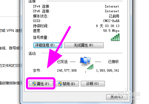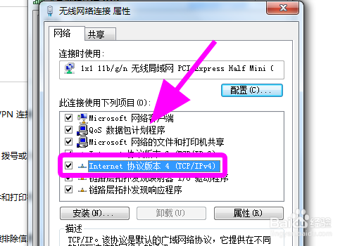 弹出无线收集毗连属性对话框,找到并点击【Internet和谈版本4(TCP/IPv4)】选项;