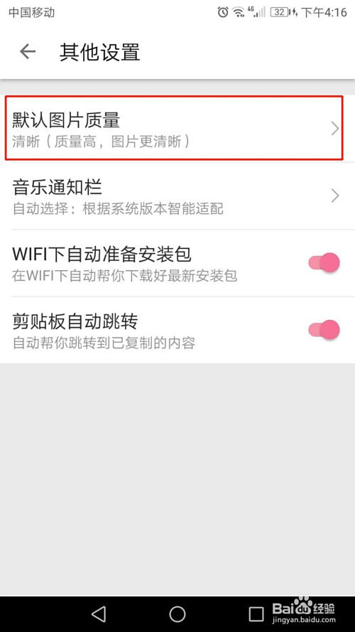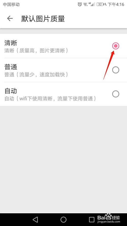 进入默认图片质量页面,按照小我环境,选择图片质量类型:清楚、通俗或者主动。