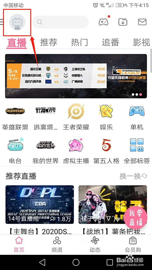 登录哔哩哔哩APP,点击页面左上角的头像。