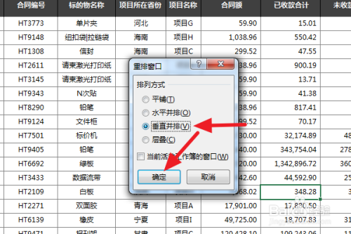 选择模式为垂直并排,点击确定。这样两个工作薄就并排显示了。