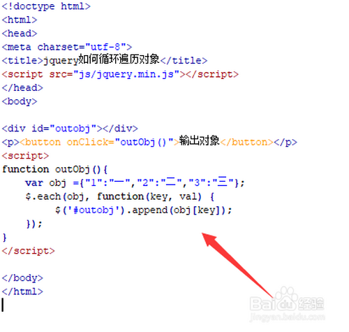 在outObj()函数内,利用each()方式遍历对象obj,此中key为对象的索引,val为对象索引对应的值。