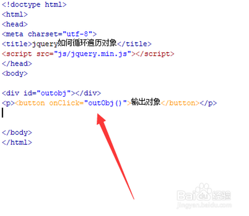 在test.html文件内,利用button标签建立一个按钮,给button按钮绑定onclick点击事务,当按钮被点击时,执行outObj()函数。