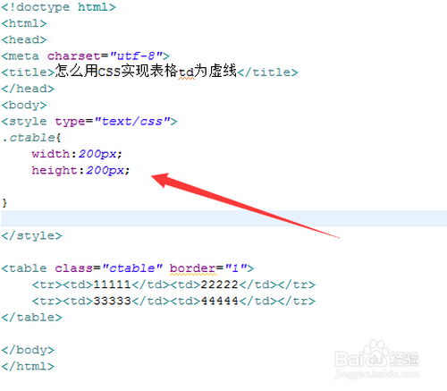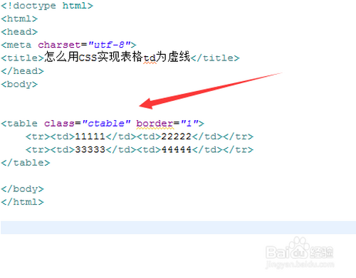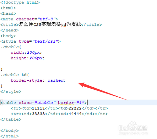 2、在css标签内,设置td单位格的样式,将border-style设置为dashed,实现虚线的结果。