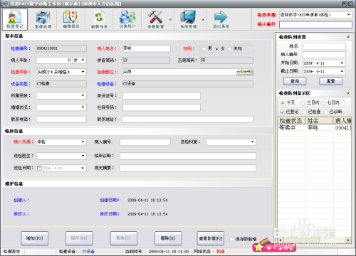 可以直接挂号病人信息,也可以接管分诊台同一挂号的信息,在病人列表中选择就诊病人。输入查抄部位时,可以先选择查抄项目,这样系统会主动过滤查抄部位。(会按照查抄项目和性别进行主动过滤)。