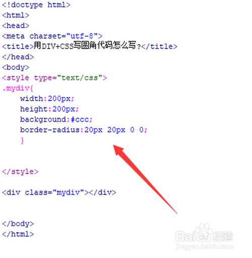 在css标签内,经由过程class设置div的css样式,界说其宽度为200px,高度为200px,布景颜色为灰色,再经由过程border-radius属性设置左上角和右上角为20px,实现圆角。