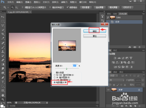 将镜头类型设为片子镜头,亮度设置为147%,按确定;