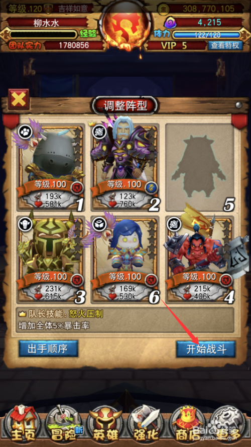 按下图所示声势设置英雄站位和出手挨次,点击起头战斗。