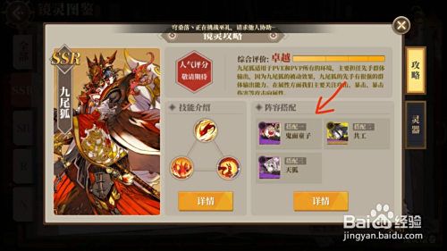 在对战过程中,可以放置鬼面孺子、共工、天狐进行搭配,这样的声势在防御和输出方面都很是好,总的来说,“九从头至尾狐”仍是值得培育的