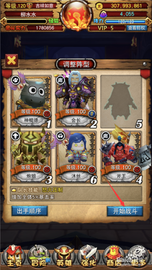 按下图所示声势设置英雄站位和出手挨次,点击起头战斗。