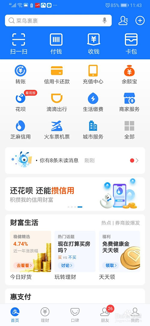 我们进入支付宝的本家儿界面,然后点击一下右下角的我的。