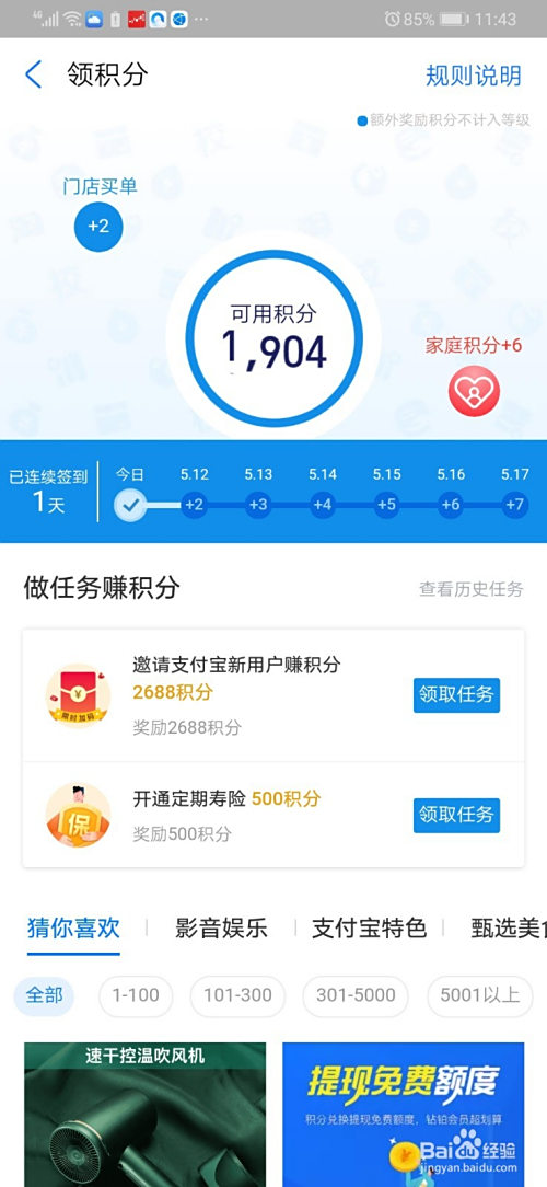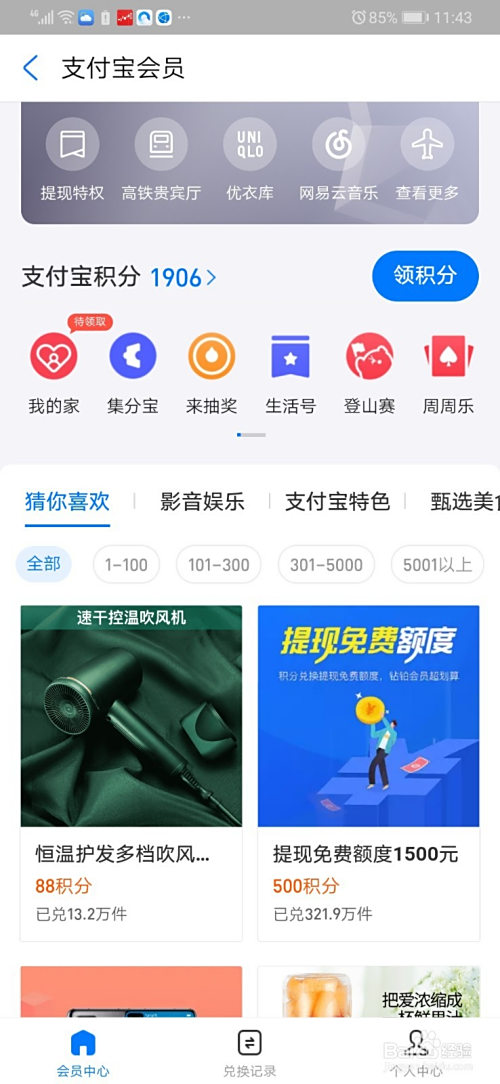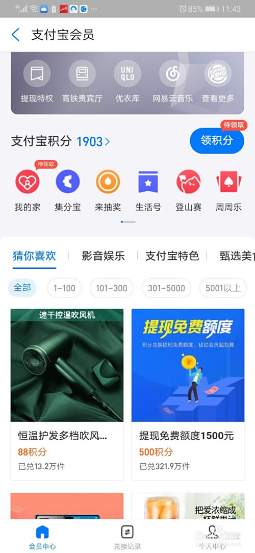 然后我们的积分就会堆集在一路,上方会有具体的显示,而我们可以用这个积分来兑换一些会员或者其他小礼品。