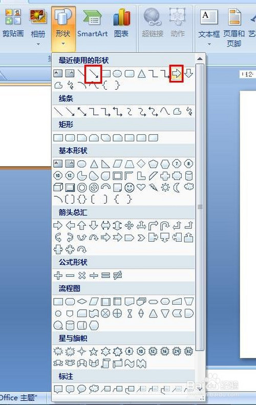 点击“外形”选项,打开下来菜单,可以选择线状箭头也可以选择二维箭头。