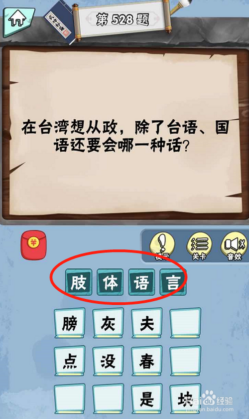脑子急转弯达人游戏Lv6绝代奇才第528关内,提问在tw想要从政,除了当地说话、国语还需要什么说话。