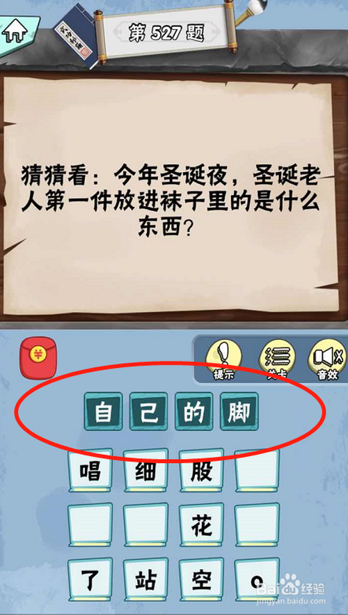 脑子急转弯达人游戏Lv6绝代奇才第527关内,提问本年圣诞夜,圣诞白叟第一件放进袜子里的是什么工具。