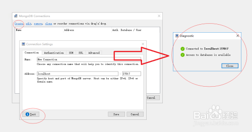 5、打开桌面上的Robomongo 0.9.0-RC10.exe 点击 弹窗中左上角的 create 然后点击左下角的 test 看是否可以毗连到MongoDB。