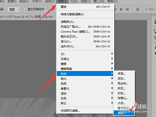 点击布景图层,选中“滤镜——扭曲——置换”。