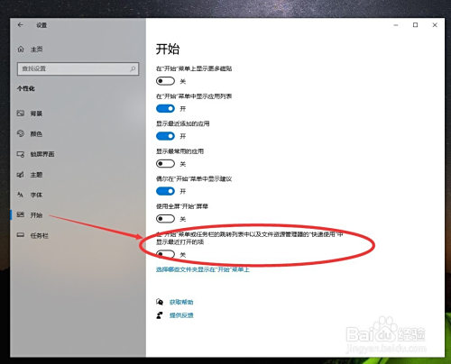 在个性化设置的界面傍边,左边选择到“起头”,右边将“在起头菜单或使命栏的跳转列表中以及文件资本办理器的‘快速利用’中显示比来打开的项”进行封闭的操作。