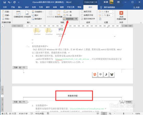 输入页眉信息,然后点击打消“链接到前一节”功能。