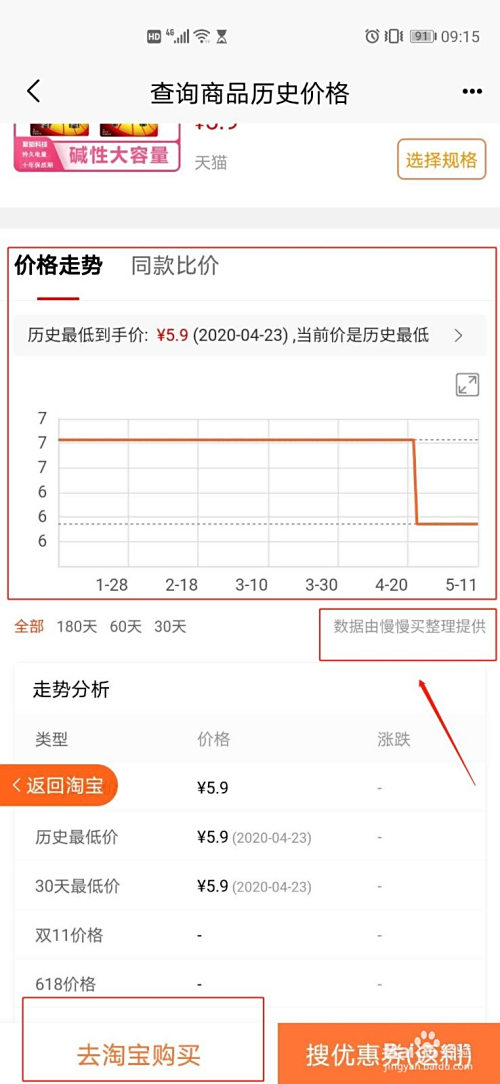 第四步期待查询完当作查看该商品价钱走势,在合适价钱下手即可。