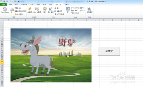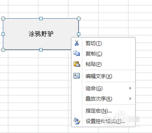 7.将按钮控件定名为“涂鸦野驴”,然后点击右键,选择“指定宏”选项。