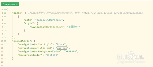 在pages.json中设置装备摆设导航栏的题目为地图组件