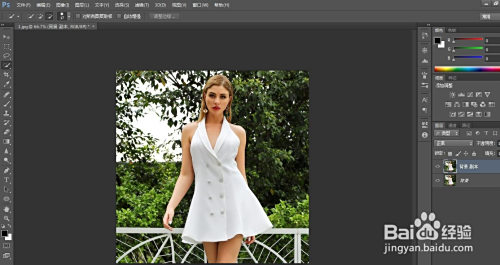 为了便利选择衣服,可以放大图片,再利用【快速选择东西】拔取衣服,别的可以选择上方的+和-来调整选区。