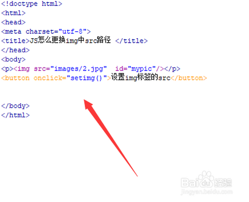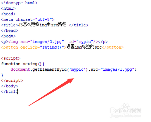 在js标签中,建立setimg()函数,在函数内,经由过程getElementById()方式获得img对象,利用src属性设置为1.jpg,实现改换img的src路径。