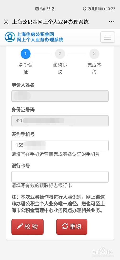第四步进行身份认证填写本人认证信息,之后点击校验。