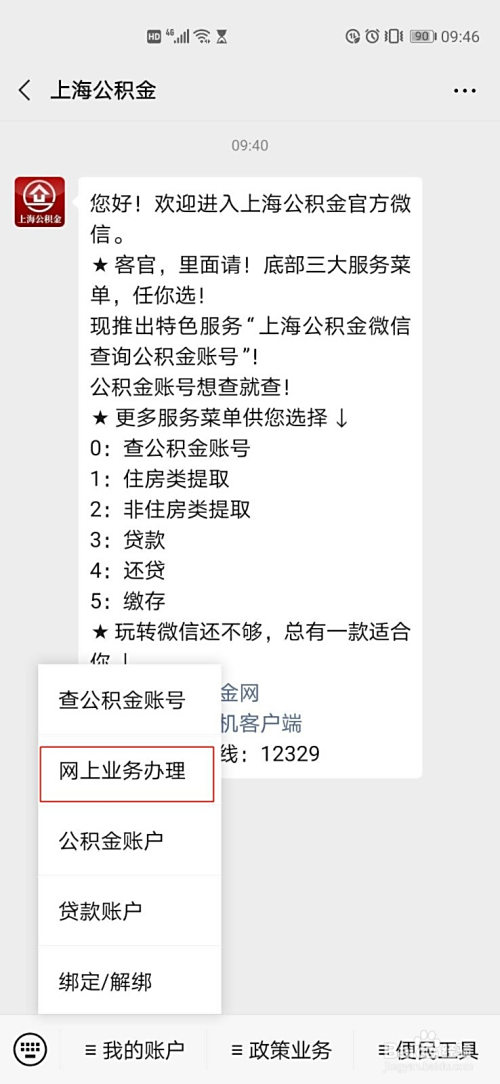 第一步存眷上海公积金微信公家号,之后点击我的账户-网上营业打点。