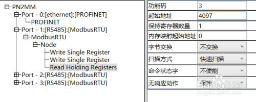 选择03功能码即读多寄放器,地址填写10进制4097,寄放器数目1个。内存映射地址为0对应I地址的第一二位