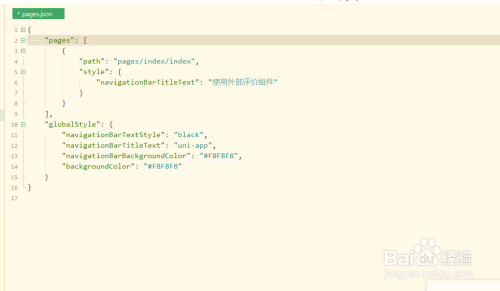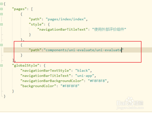 随后在pages.json中设置装备摆设引入的评论组件的路径