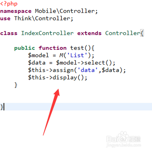 2、在test()方式中,再利用assign()方式将后端数据传递给前端test.html文件,并利用display()方式显示模板文件。