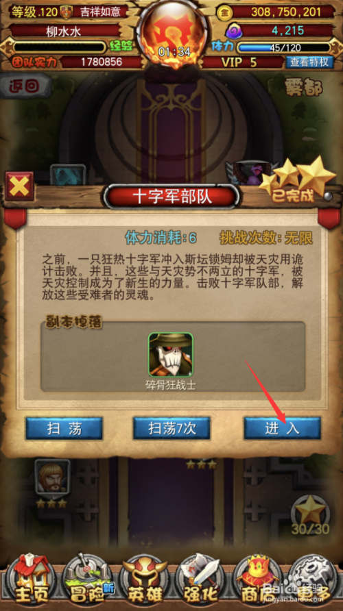 点击游戏本家儿菜单冒险,再点击子菜单副本按钮。