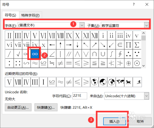 4. 将字体设置为“通俗文本”,子集设置为“数学运算符”,找到∞,接着点击“插入”