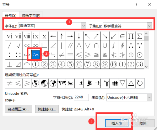 4.将字体设置为“通俗文本”,子集设置为“数学运算符”,找到≈击选择,接着点击“插入”