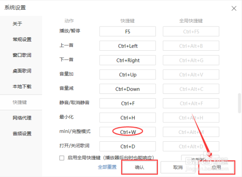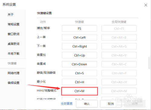 进入“快捷键设置”界面后,点击“mini/完整模式”右侧快捷键列对应方框中肆意位置,之后在键盘上按下所需要的某一个键或组合键。见下图