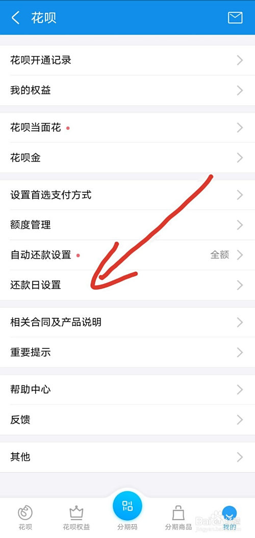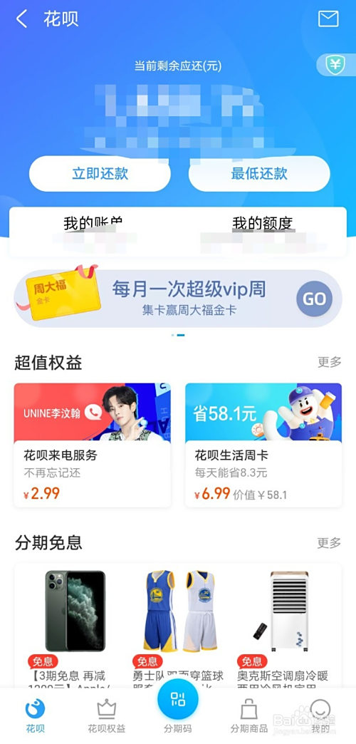 接着,进入花呗本家儿界面后,点击底部导航中有一个“我的”,如下图